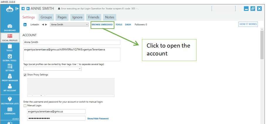 - Start connecting it to Jarvee and follow the steps below