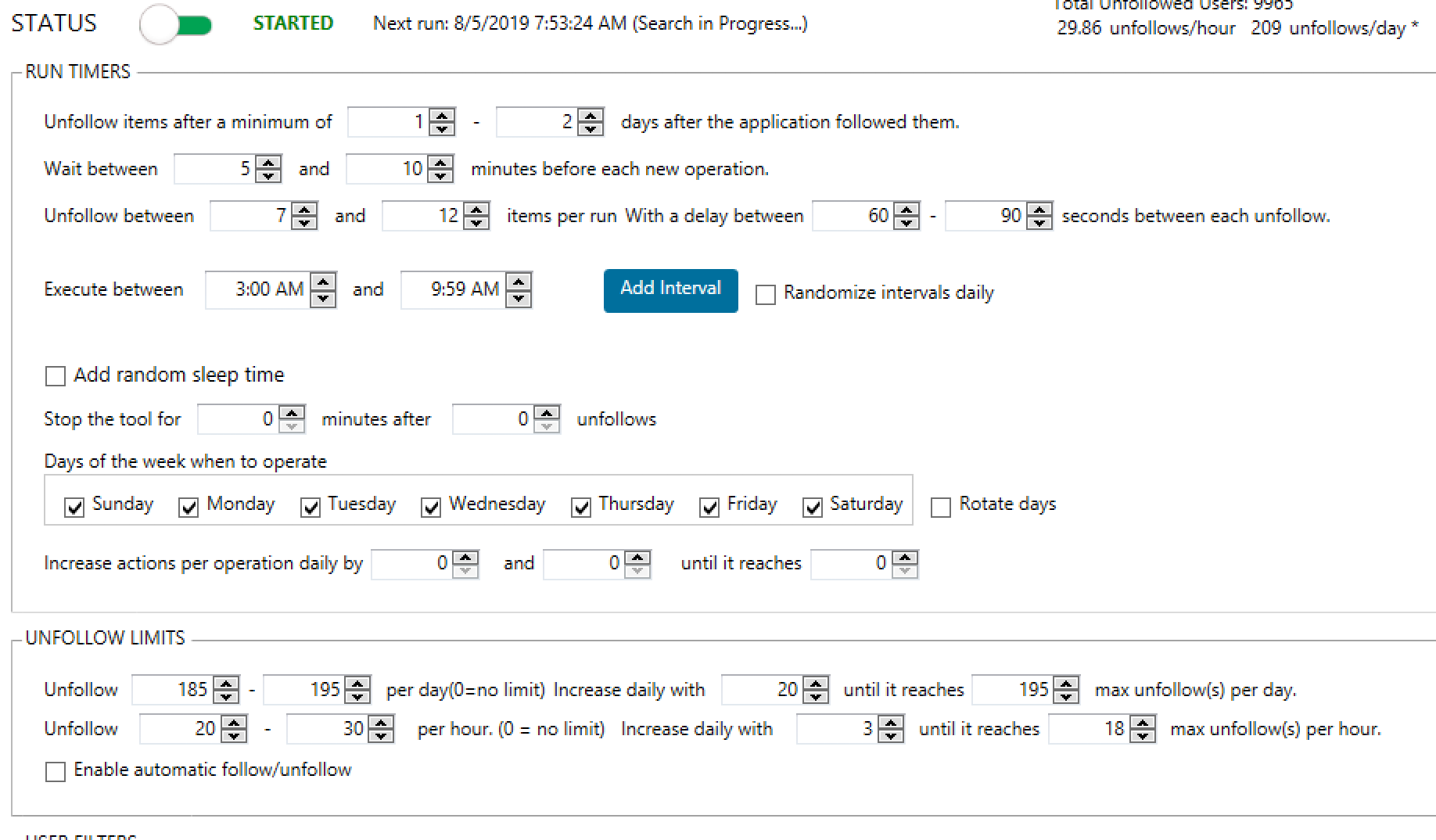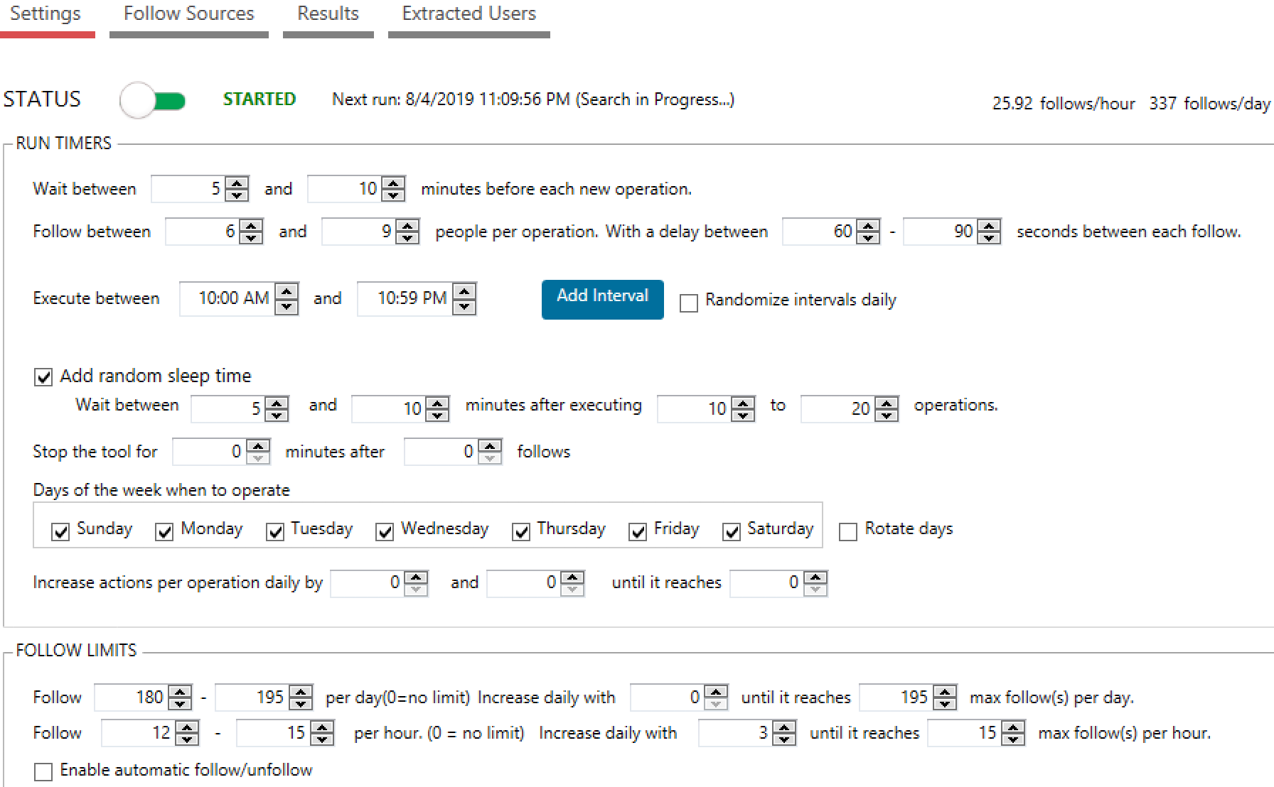 Technically you can have nearly 3 of this runs in one hour (3x 22 minutes, 3x 9 follows = 27 follows). So the tool can do way more follows per hour as you set it to. There where it tries to go over 12-15 it gets hold back by its settings itself.