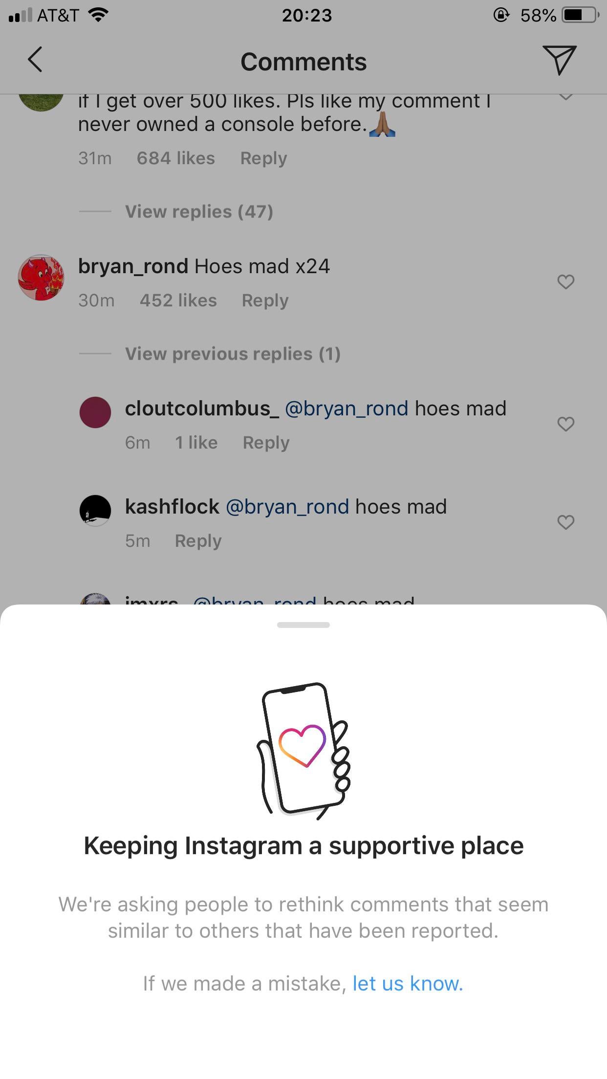 When you post comment with foul language IG ask you to rethink. Comment still gets posted